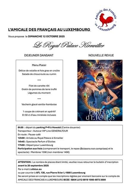 L'AFL vous propose une journée au Royal palace de Kirrwiller avec repas et spectacle.