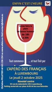 Prochain apéro de l'AFL le jeudi 2 octobre 2025 à partir de 18 h. Au plaisir de vous retrouver nombreux au Novotel 35, rue du Laboratoire. Parking souterrain sur place, arrêt de bus aux Rotondes.