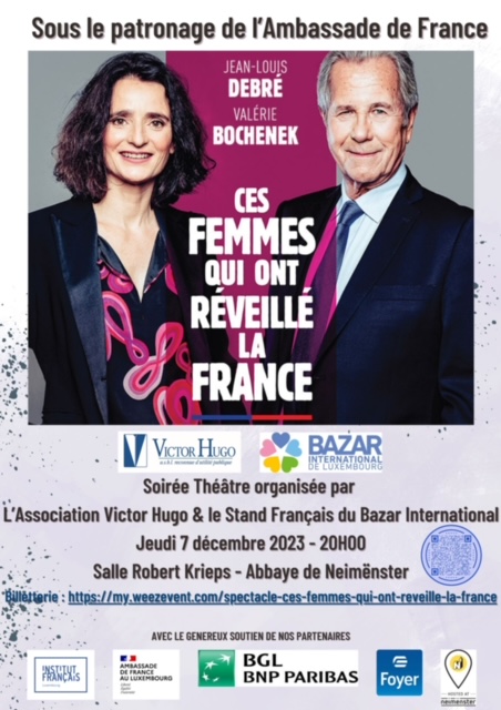 L’Association Victor Hugo a le plaisir de vous transmettre l’invitation à la représentation de la pièce « Ces Femmes qui ont réveillé la France » le jeudi 7 décembre 2023 à 20H00 (flyer en PJ).